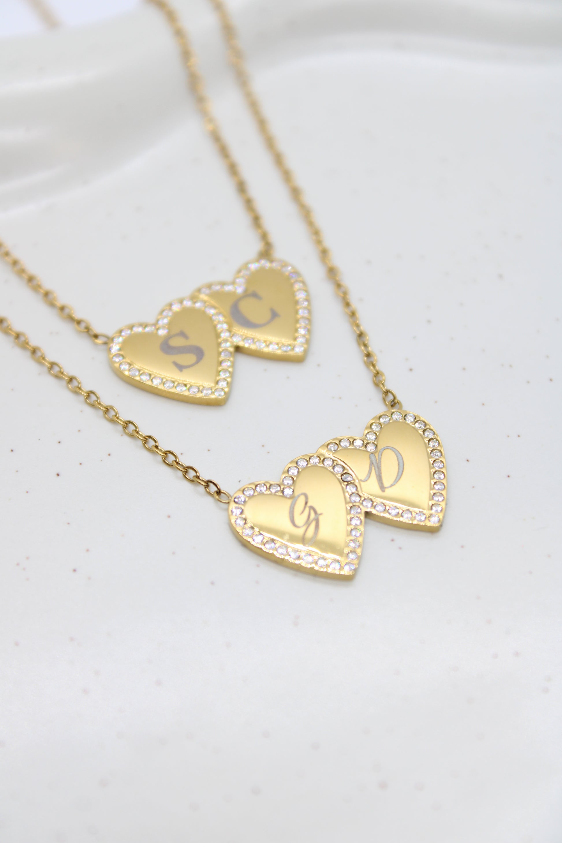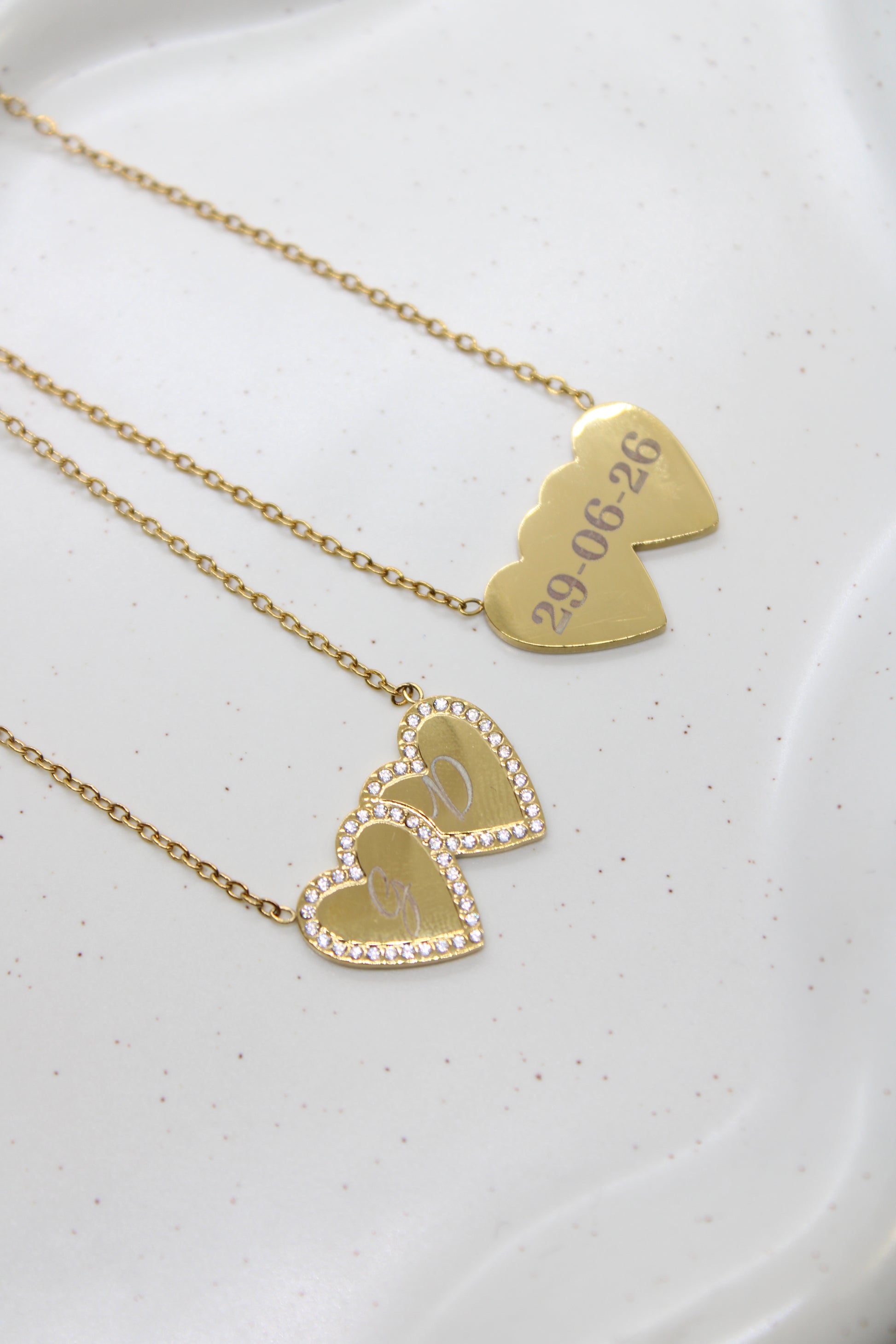Collana in acciaio inox con cuoricini circondati da zirconi sui quali è possibile incidere, è possibile incidere in corsivo o in stampatello sia fronte che retro
