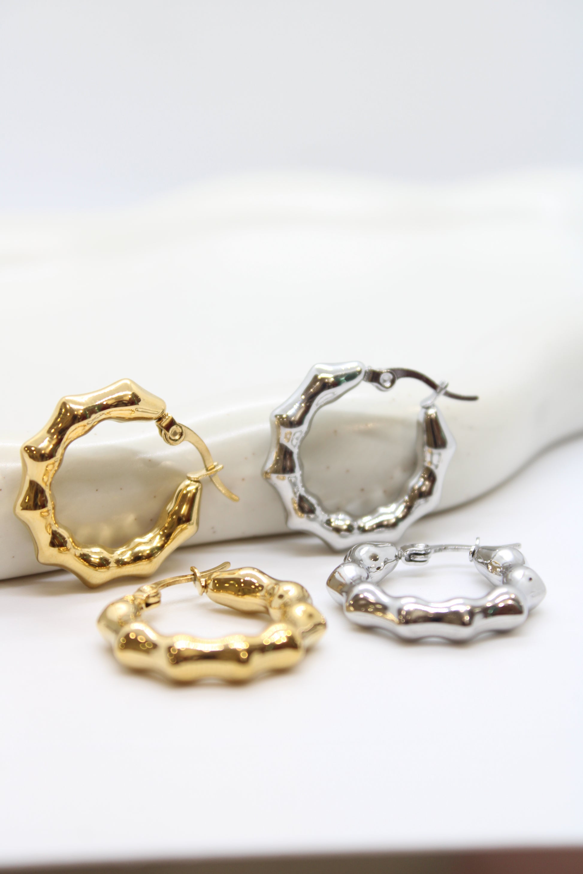 Orecchini in acciaio inox disponibile in silver & gold con chiusura a ponte